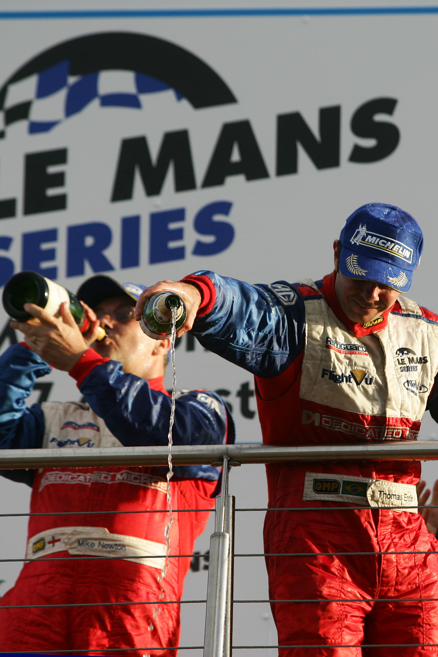 blizzard of champagne soaks the victorious RML drivers.
