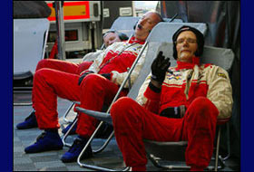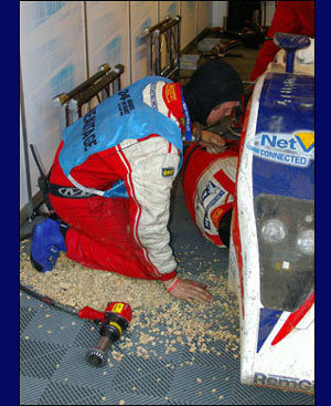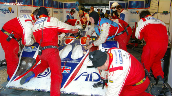 Behind him the action continued unabated. While the left side of the car was being rebuilt, the right hand side was being painstakingly inspected. What had happened once could happen again, and even at this late stage in the race, nobody was prepared to take chances with the car or, more important, the man inside it. Amazingly, despite what looked to be a violently physical accident, the rest of the car had survived almost unscathed, confirming the resilience of carbon-fibre construction. Nobody was taking any chances though, and every nut, bolt and accessible component that could be examined was checked for tightness or damage.