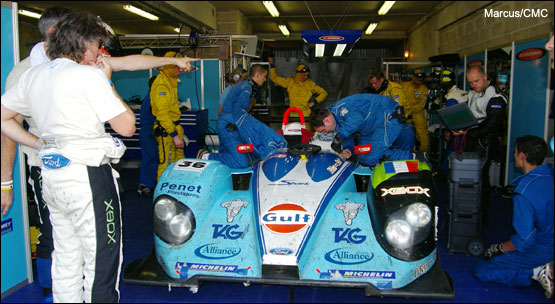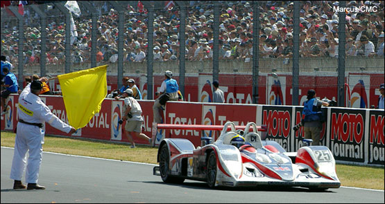 The team's next target was the Luc Alphand Porsche, being piloted by Jerome Policand, four laps ahead. Passing the #72 entry would not happen for a while, and not while Warren was in the car. At just after half-six he would hand over the MG to Thomas Erdos, and once again, the dice would tumble favourably. It was a straightforward and reassuringly rapid pitstop that saw Erdos heading back into the fray with barely a heartbeat missed. "We've just got to try and keep this thing going," said Warren. Another with similar views was Scot Allan McNish, barging headlong into the tyrewall at Indianapolis when a tyre failed on his Audi R8. He got it back to the pits and the car was racing again inside ten minutes. Not so Xavier Pompidou in the T2M Porsche, suffering a massive impact at the same corner. That car wouldn't be moving again - ever - although Xavier was amazingly unscathed.