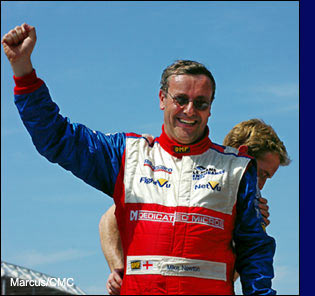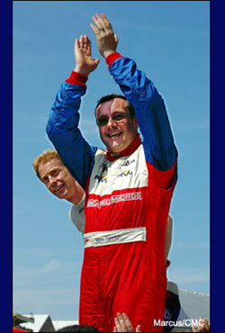 As luck would have it – and didn’t it always throughout this race? – Tommy was ahead of the race leaders on the track, so the finish had been staged for several minutes before the glare of the MG’s headlights could be seen glittering through the haze. It couldn’t have worked better. With a flourish, the commentator announced the arrival of the LMP2 winner. In solitary splendour, and accompanied by an enormous cheer from the crowd, the diminutive MG Lola EX264 wailed its Judd-inspired battle-cry across the finish line, Tommy pedalling the throttle into a crescendo of defiance. Not only was he celebrating the finish the team so much deserved; not just a podium, but also that rare distinction, victory at Le Mans. Mike Newton and Warren Hughes both climbed high atop the pitwall to welcome home their car, their feet swathed in the waving arms of a mass of cheering and ecstatic team members, better halves and sponsor’s guests. It was an enormously emotional moment, and the relief that comes after so many hours of strain and pressure was clear for anyone to see.